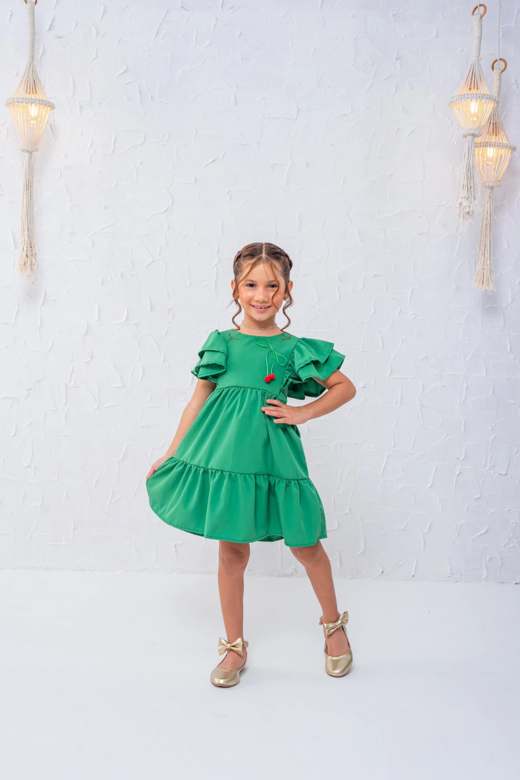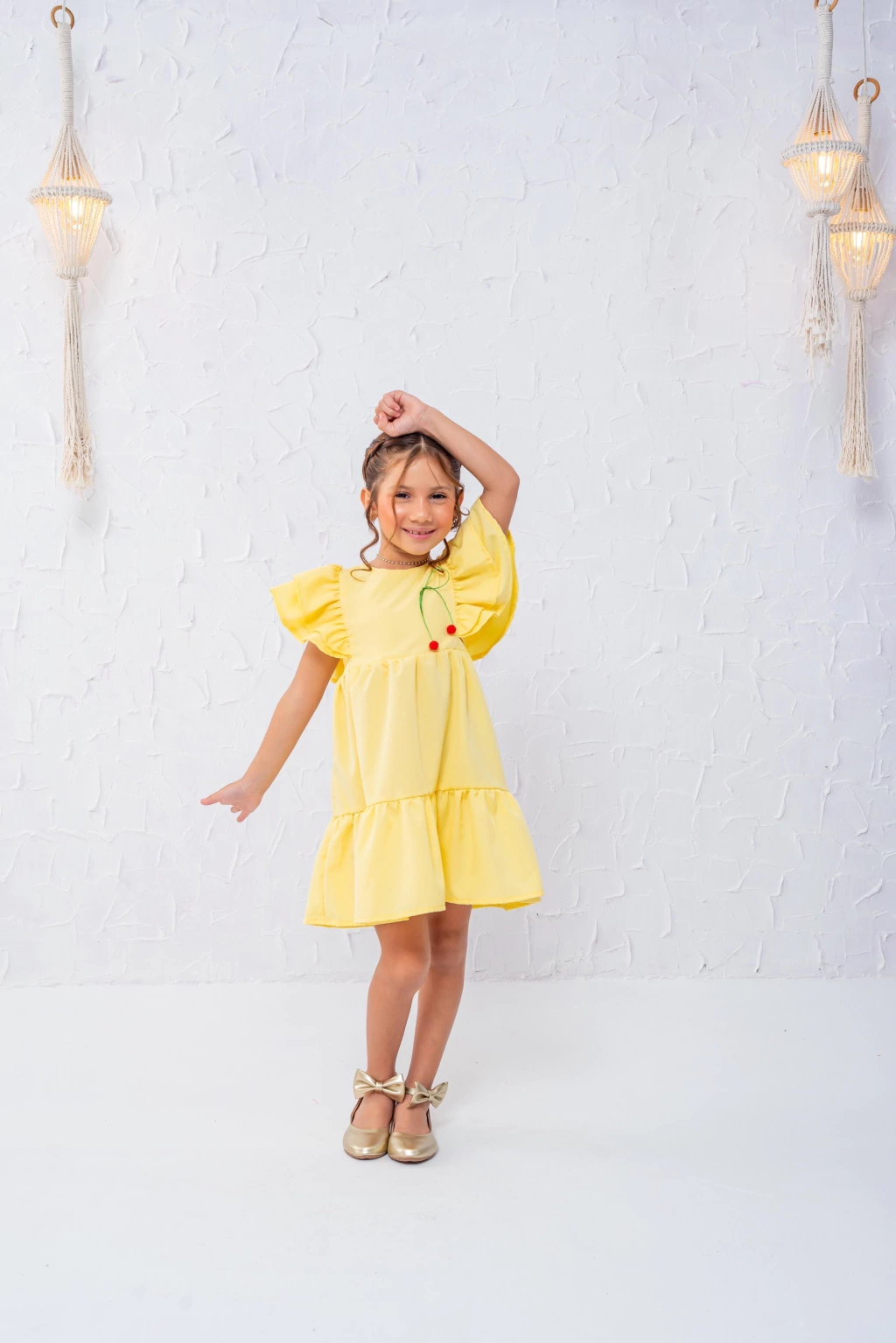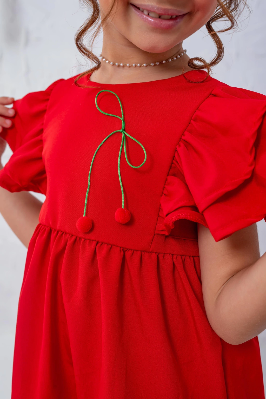Vestido no crepe, contém amarração. Cereja costurada a mão.
